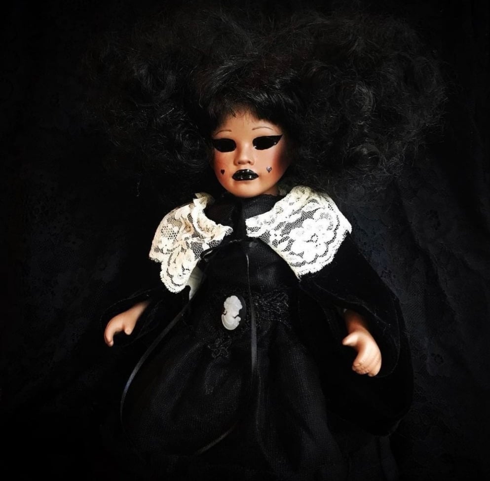 Refurbished porcelain doll. The eyes light up, and the switch is located underneath her hair. Instructions will be sent with the doll.